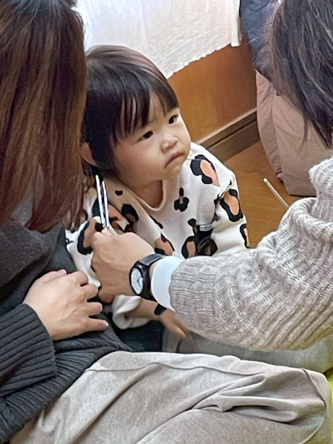 音叉で「ラー」の音を聴くよ。静かに聴けています