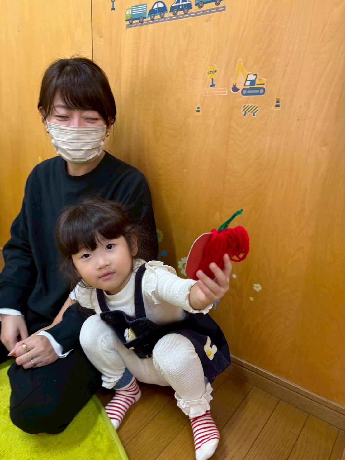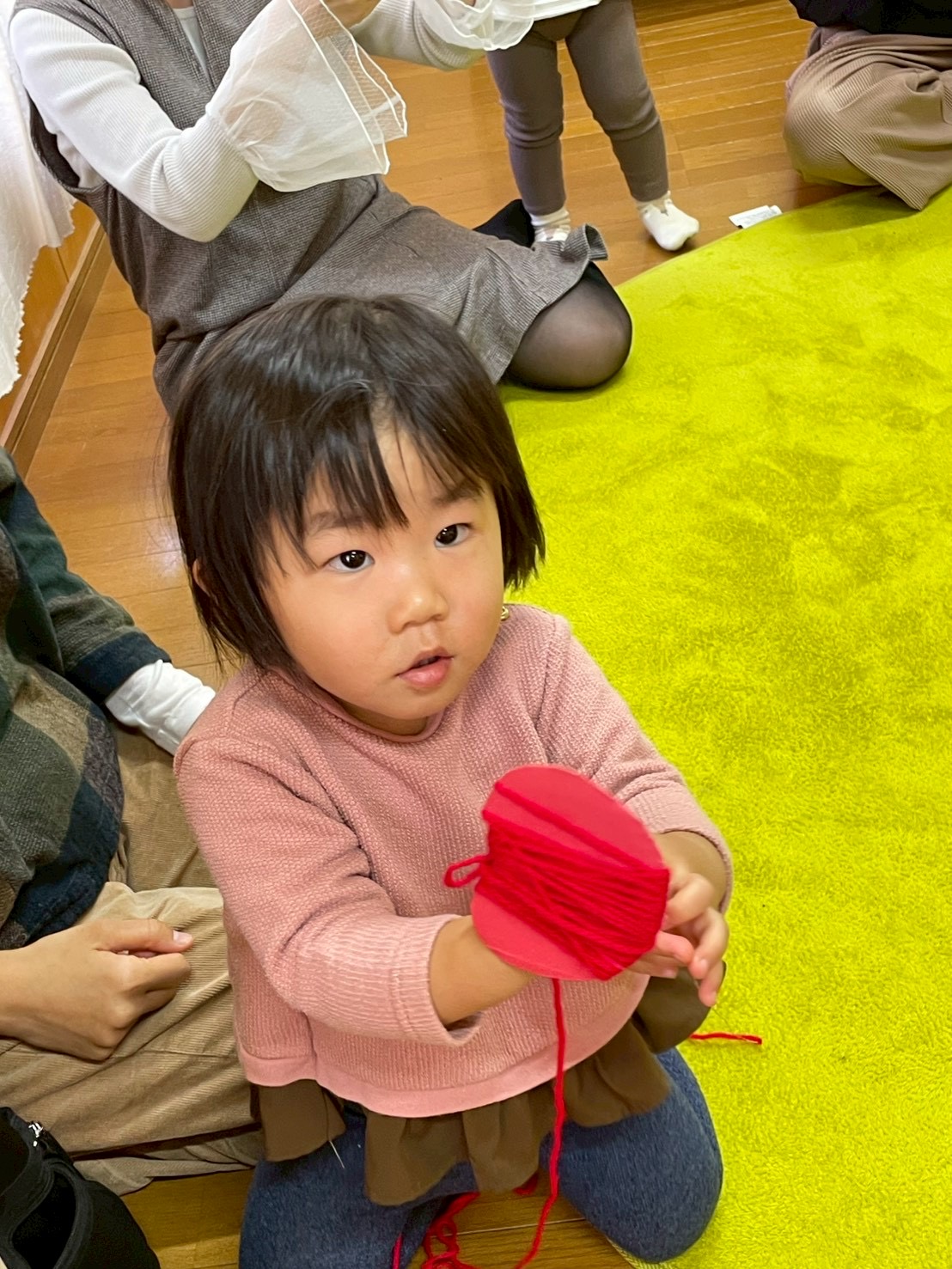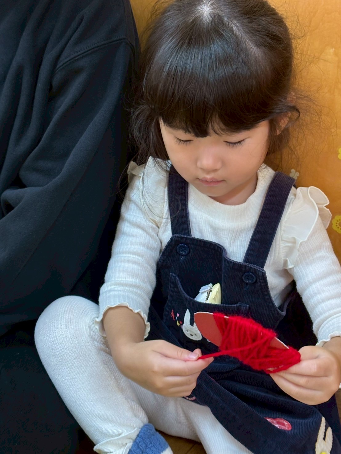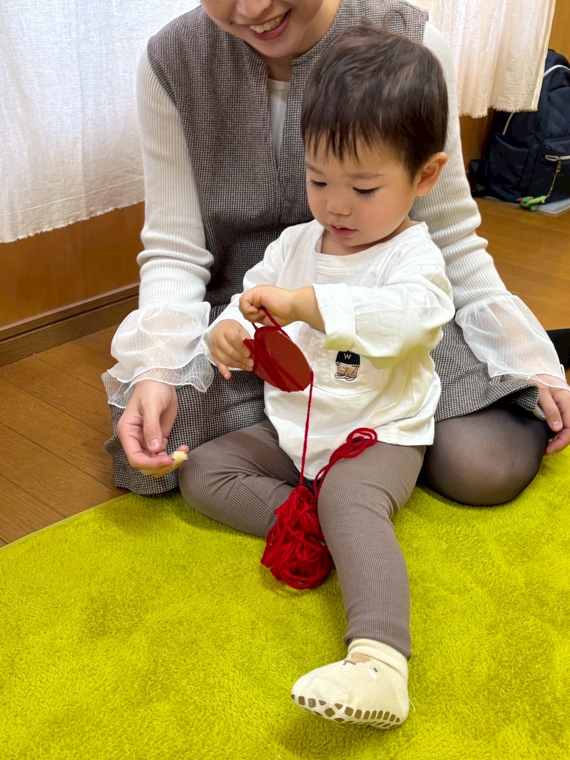 今日のクラフトは毛糸を巻き巻きして、りんごを作るよ〜🧶♪いとまきまき〜いとまきまき〜