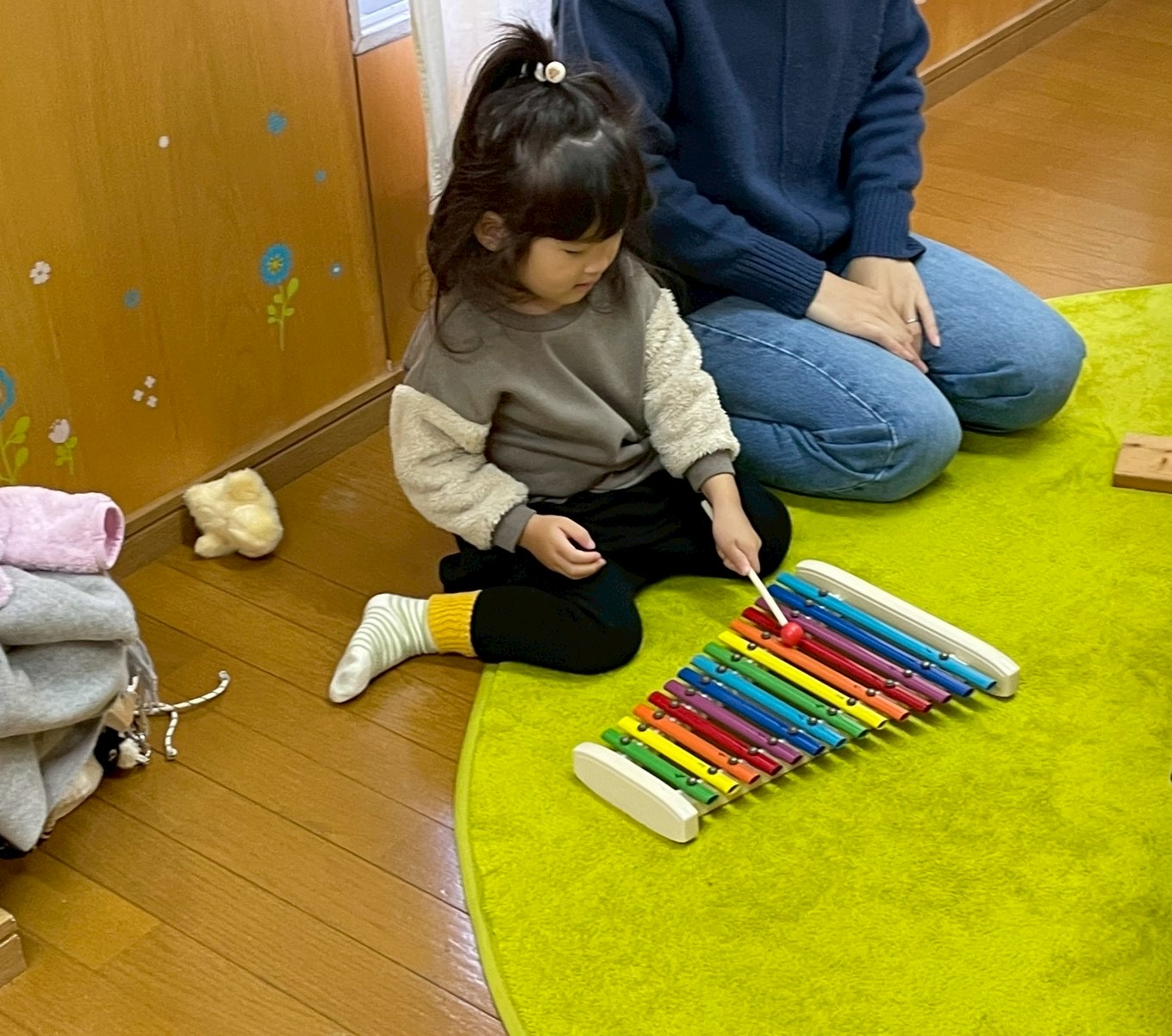 こじかクラスは鉄琴、木琴、ベルでドレミの配列を確認!