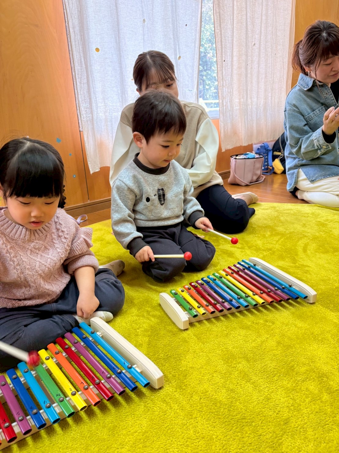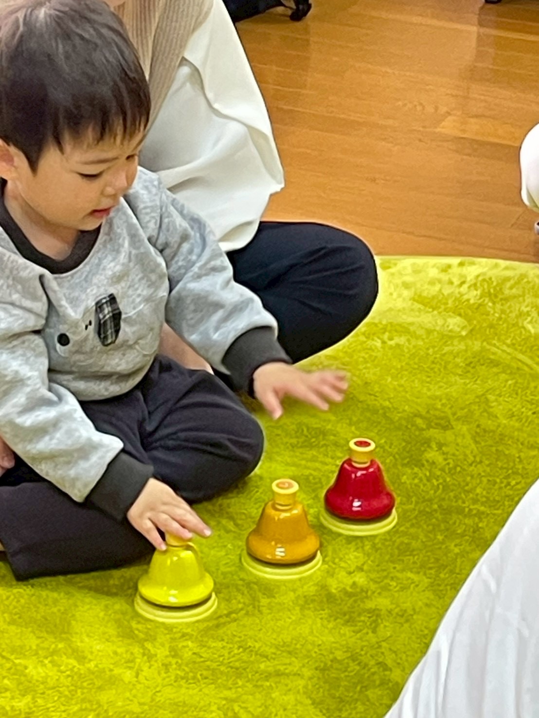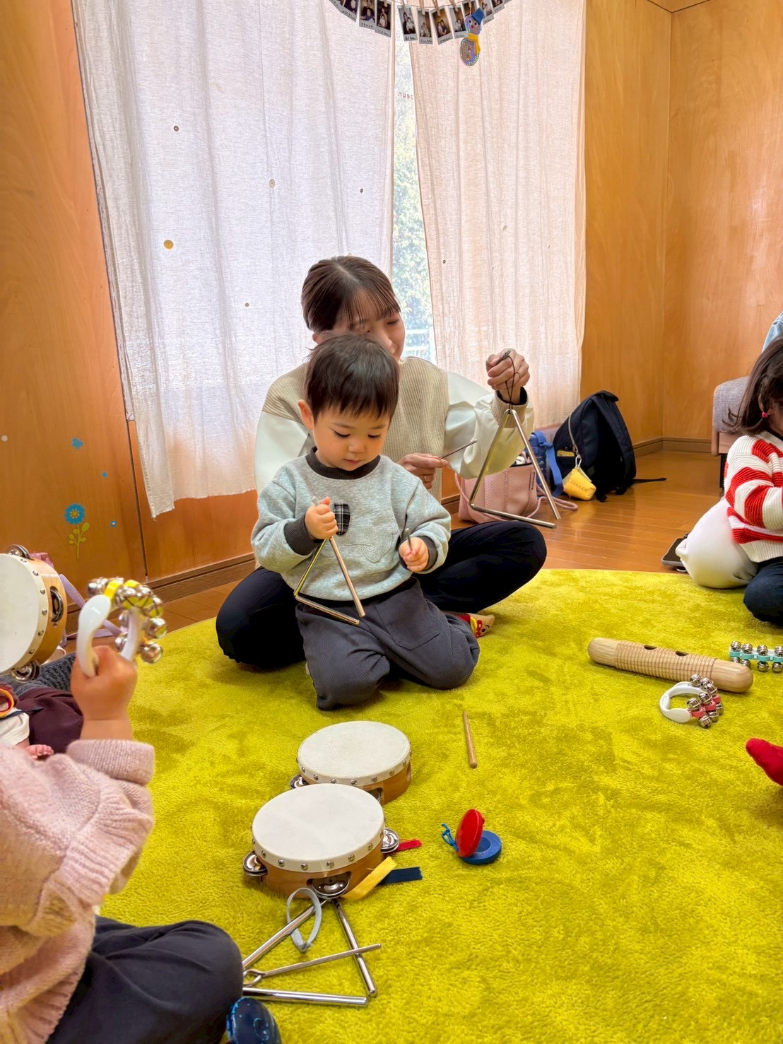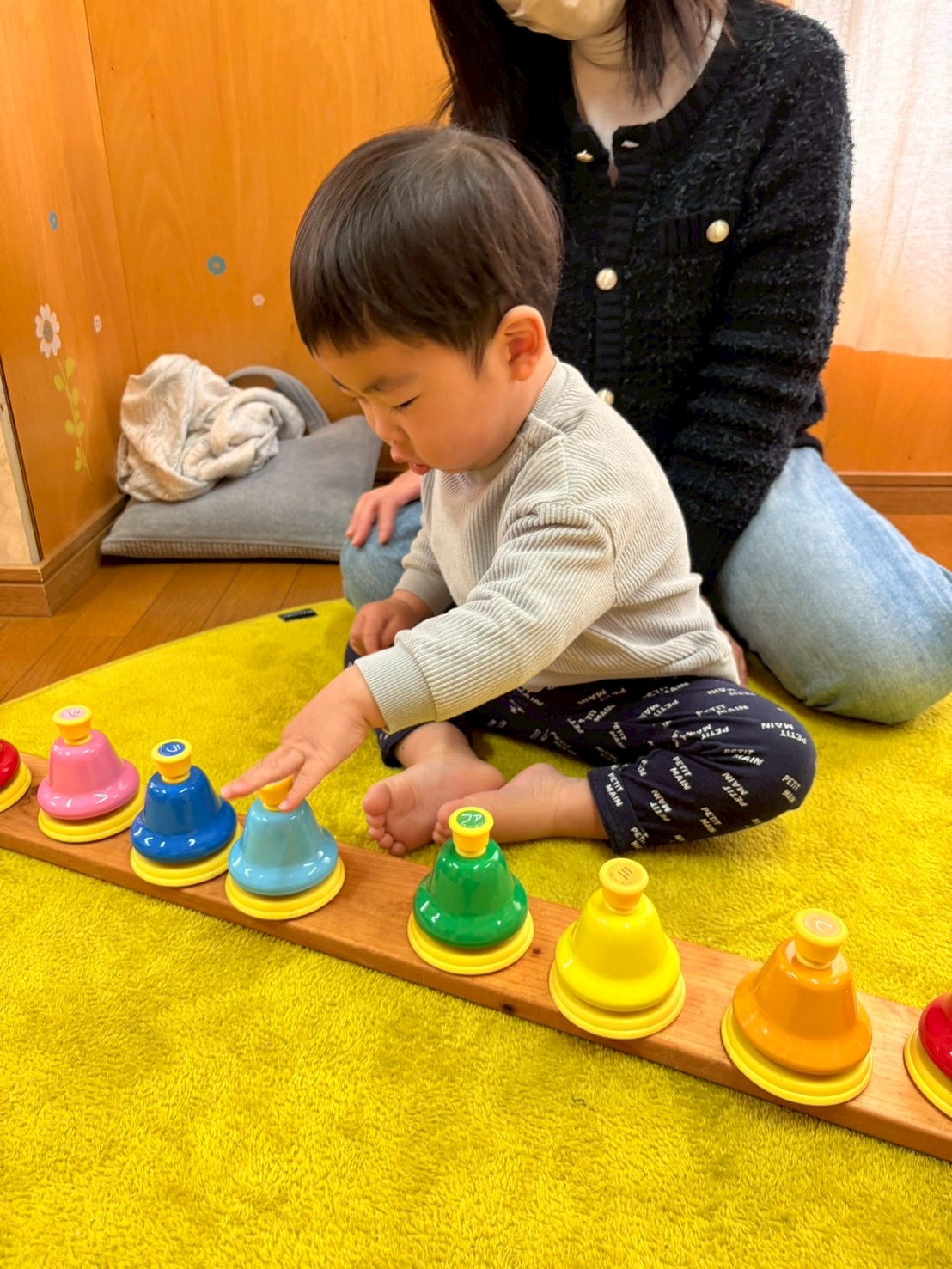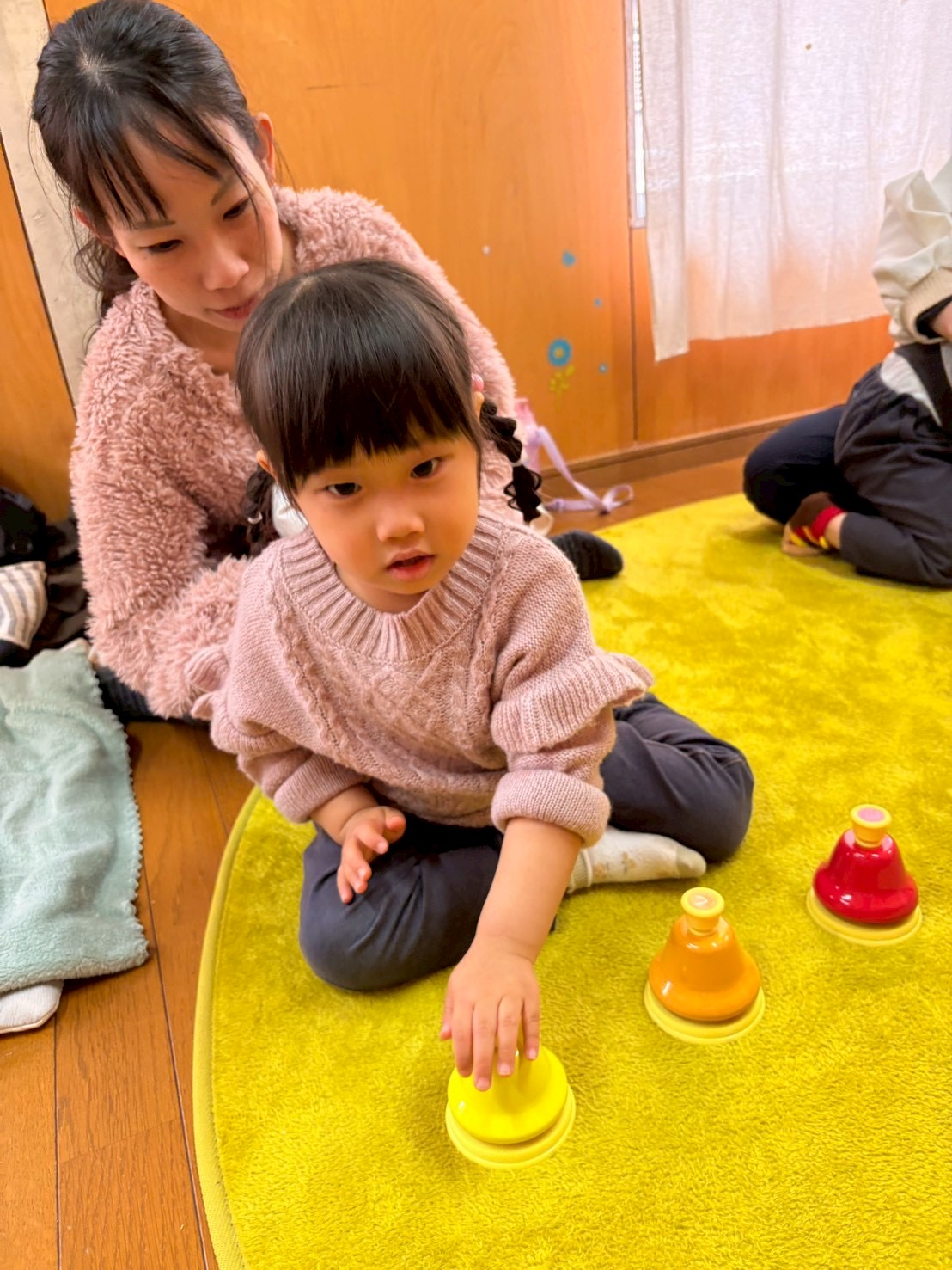 ドレミのハンドサインのお歌に合わせてこじかクラスは鉄琴を、うさぎクラスはベルを演奏してもらいます🎶