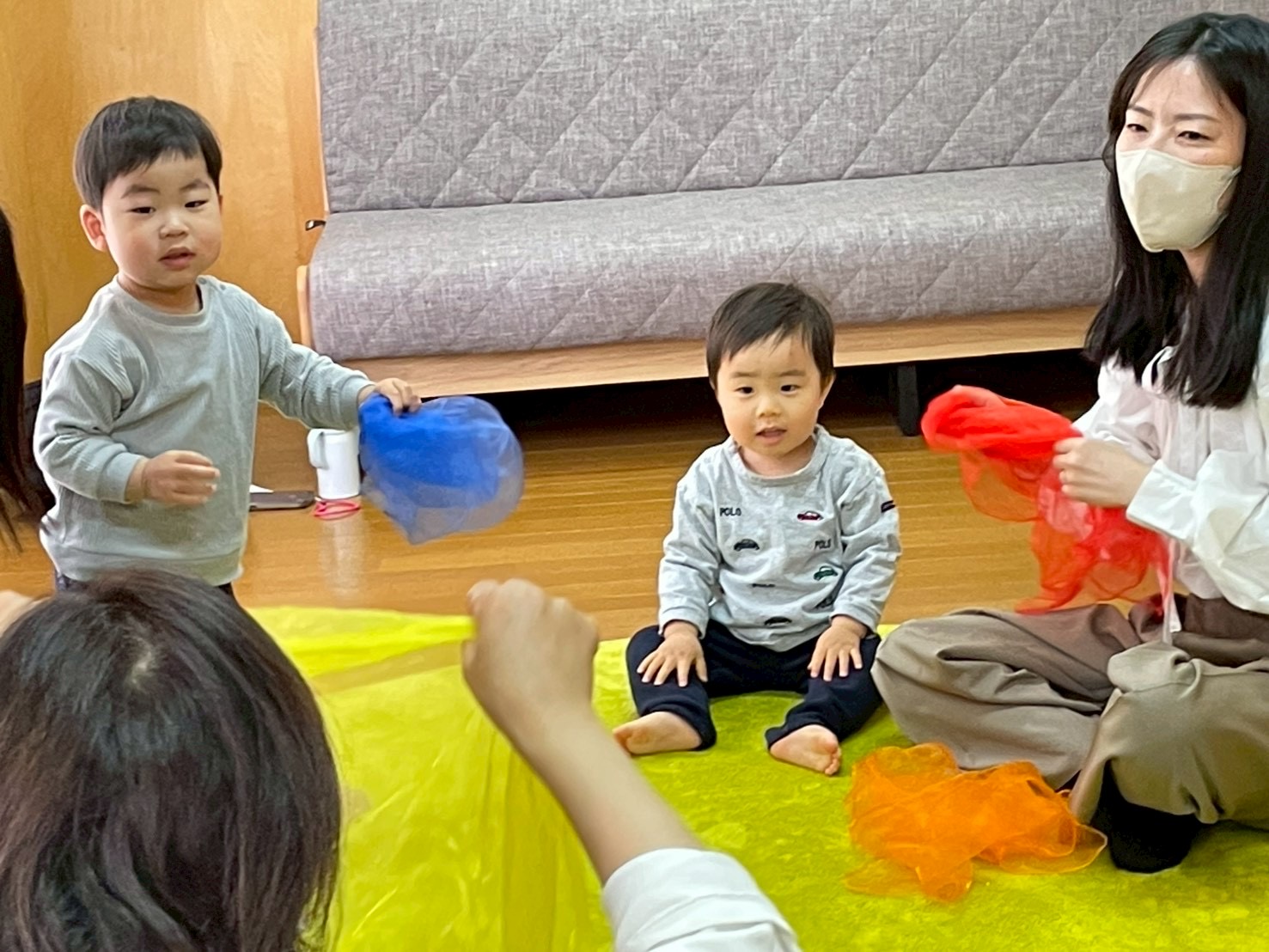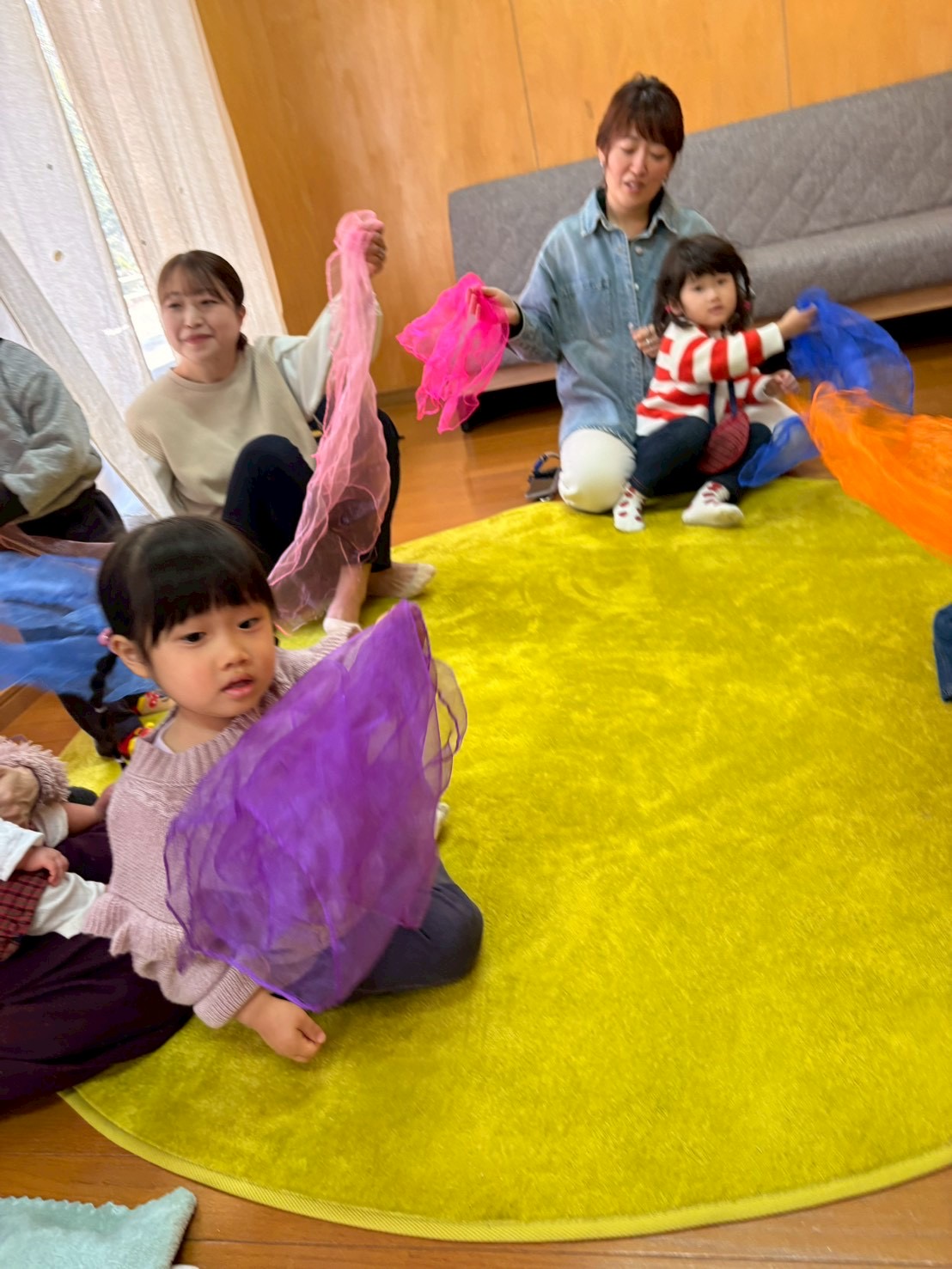 🏫お山の幼稚園には8時になると、りすのぼうやがやってきますよ🐿️9時になるとやぎさん、10時になるとくまさんがやってきます。♪山のワルツのお歌に合わせてシフォンをユラユラ〜3拍子でユラユラ〜