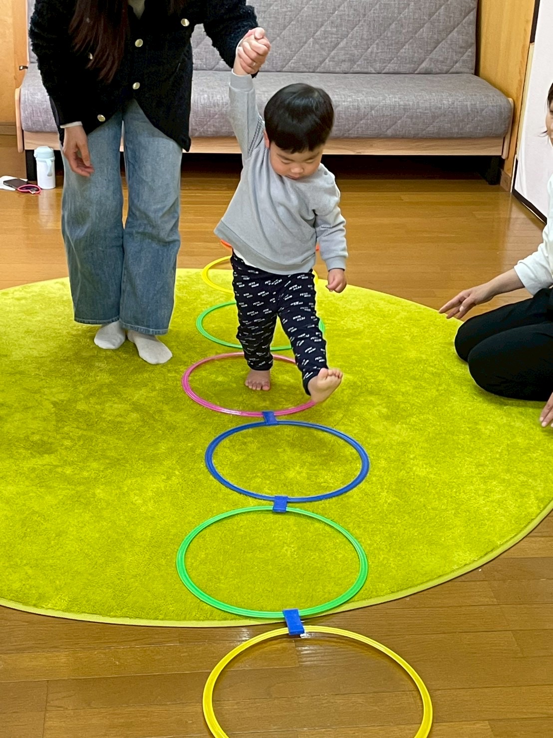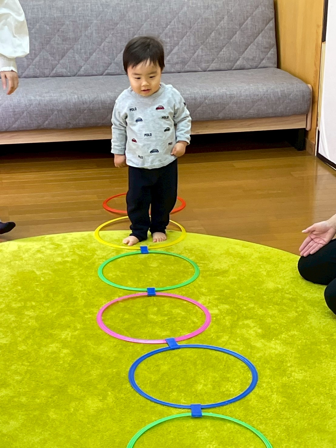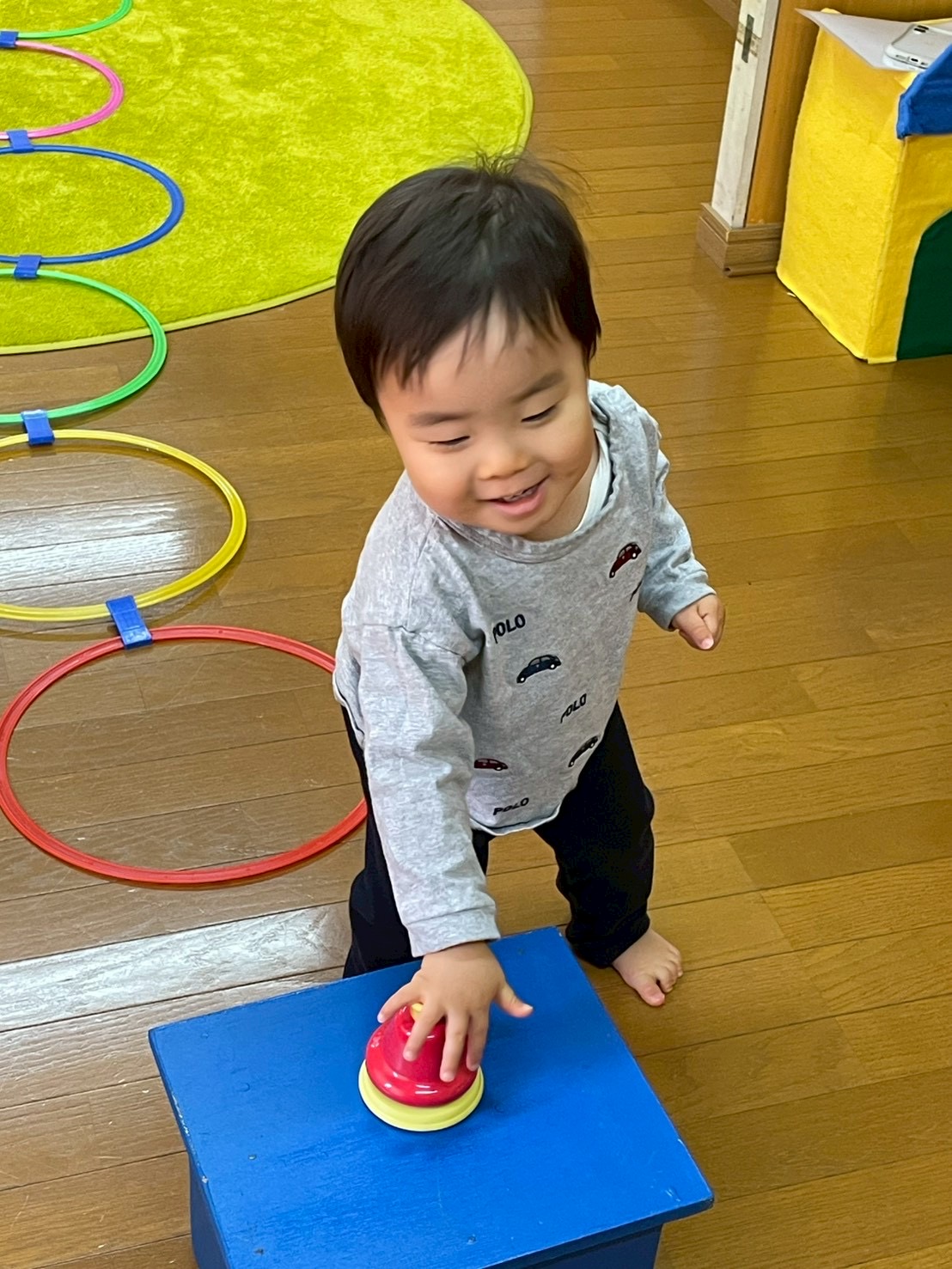 並んだフープをジャンプして⤴️⤴️ドレミファソラシド最後は高いドの音のベルを鳴らそう!