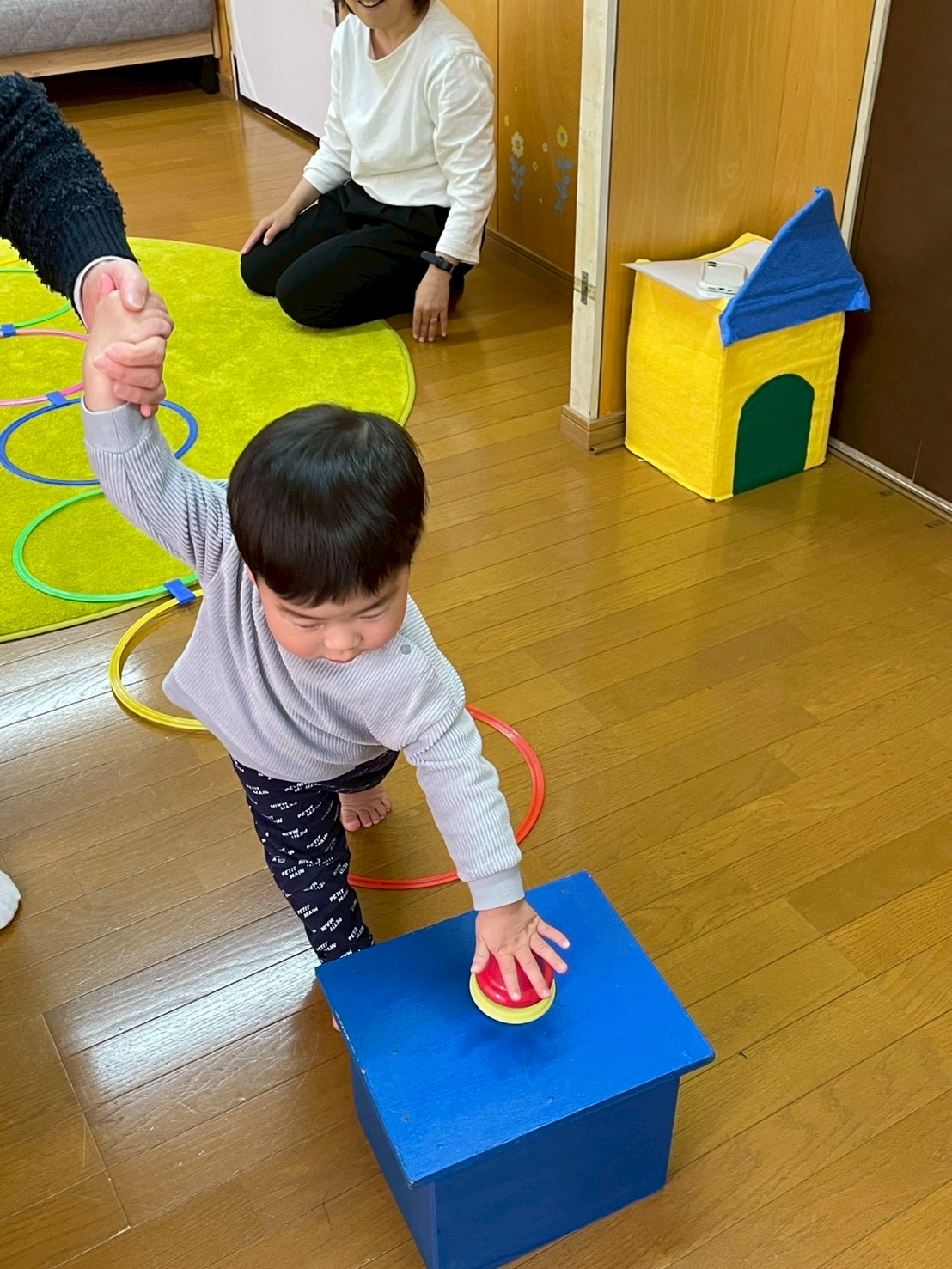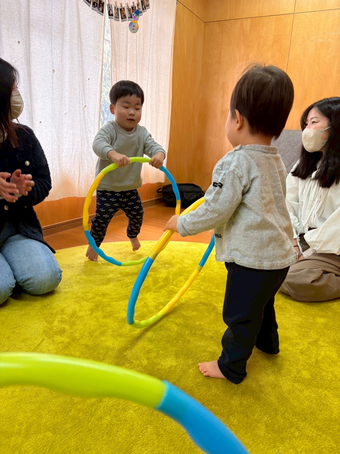 うさぎクラスはフープでトントン、ピアノの音に合わせてリズム打ち🎵